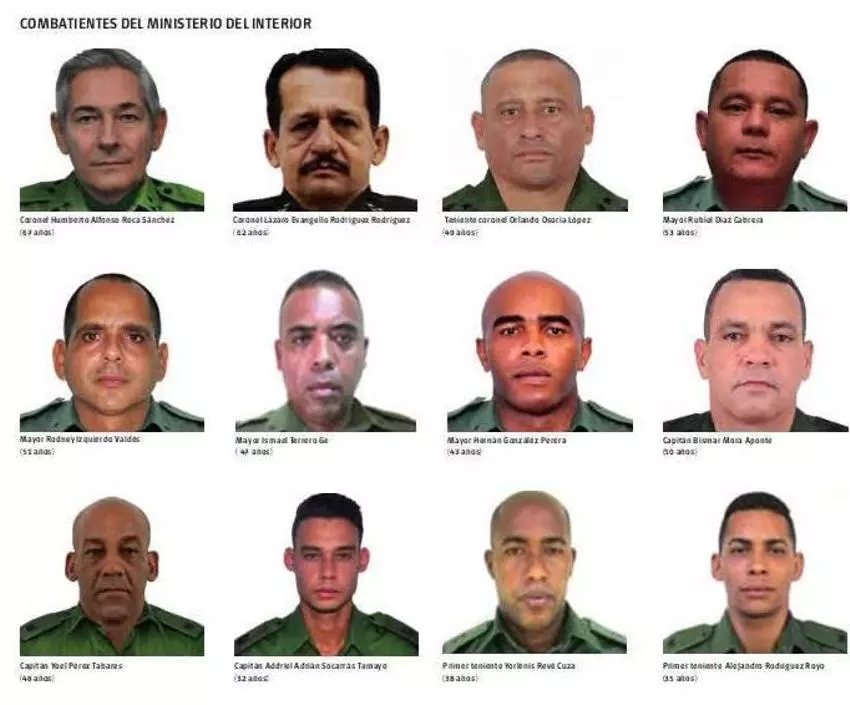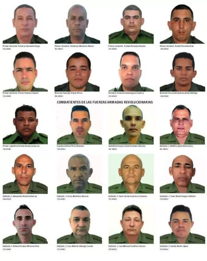 The agents, they claim, “were carrying out missions on behalf of the Revolutionary Armed Forces and the Ministry of the Interior, at the request of their counterparts in the South American country.” Among the deceased from the Ministry of the Interior are two colonels (Humberto Alfonso Roca Sánchez, 67, and Lázaro Evangelio Rodríguez Rodríguez, 62), a lieutenant colonel (Orlando Osoria López, 53), four majors (Rodney Izquierdo Valdés, 51; Ismael Terrero Ge, 49; Rubiel Díaz Cabrera,53; and Hernán González Perera, 43), and three captains (Yoel Pérez Tabares, 48; Adriel Adrián Socarrás Tamayo, 32; and Bismar Mora Aponte, 50). The FAR, for its part, lost only one commander: Captain Adrián Pérez Beades, 34 years old, and all the others were troops and a non-commissioned officer.